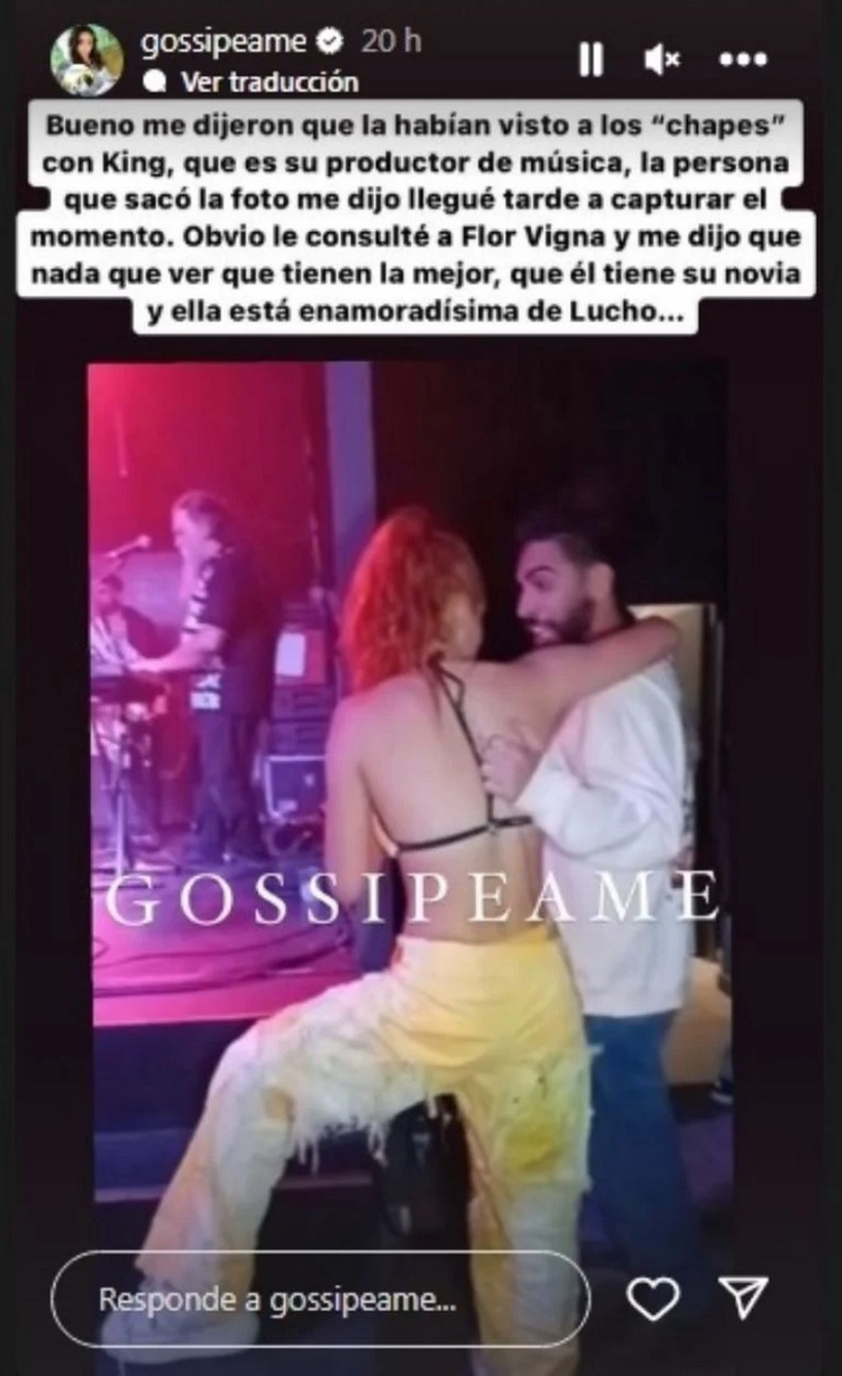 Lo cierto es que no fue otra que Pochi de Gossipeame quien compartió la imagen en cuestión así como también la charla que mantuvo con Vigna sobre esta polémica foto precisamente. "Bueno, me dijeron que habían visto a Flor a los 'chapes' con King, su productor musical. La persona que sacó la foto me dijo: 'Llegué tarde a capturar el momento'", detalló picante la instagramer desde una storie.