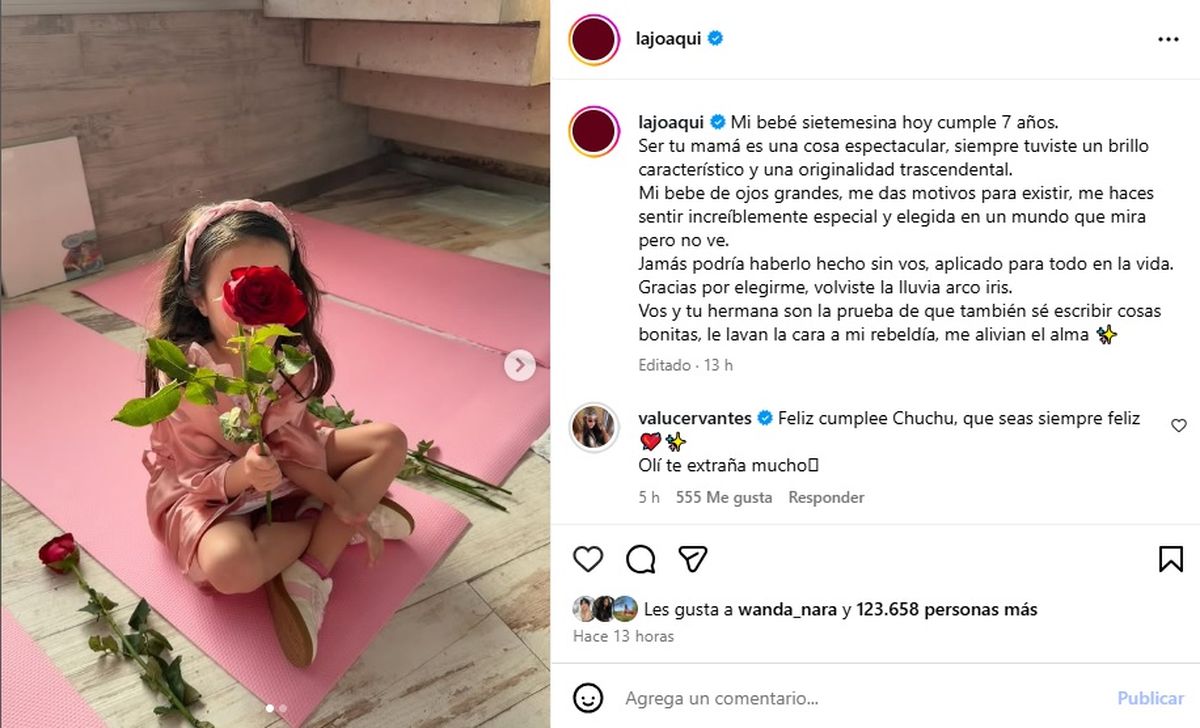 Otro detalle no menor fue el curioso like que le dejó Wanda Nara a La Joaqui en la publicación virtual, así como también -ya desde Londres- Valentina Cervantes le hizo saber: "Feliz cumple Chuchu, que seas siempre feliz. Oli te extraña mucho". Vale señalar que en las últimas horas se filtró el tenso momento entre Joaquina y Wanda Nara durante la despedida de Valu del reality, tras un letal comentario de la pareja Luck Ra hacia la conductora y en clara defensa de Cervantes, a raíz de los mensajes que la mediática le habría enviado a Enzo Fernández, nada menos que el marido de Valentina.