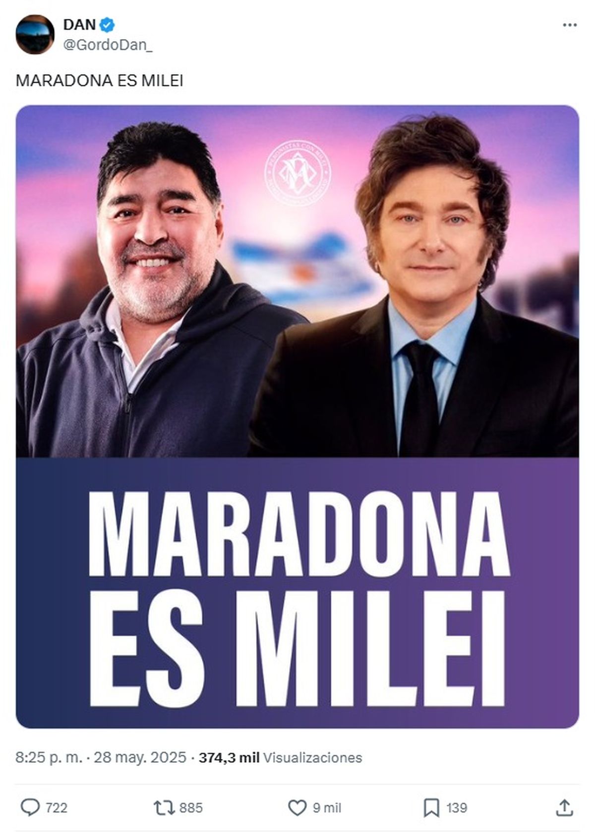 En las redes sociales, y luego de que Verónica Ojeda comentó en charla con Eduardo Feinmann en A24 que su hijo Dieguito Fernando era "fanático" de Javier Milei, el Gordo Dan se hizo eco en X de una imagen montada del astro del fútbol al lado del presidente.