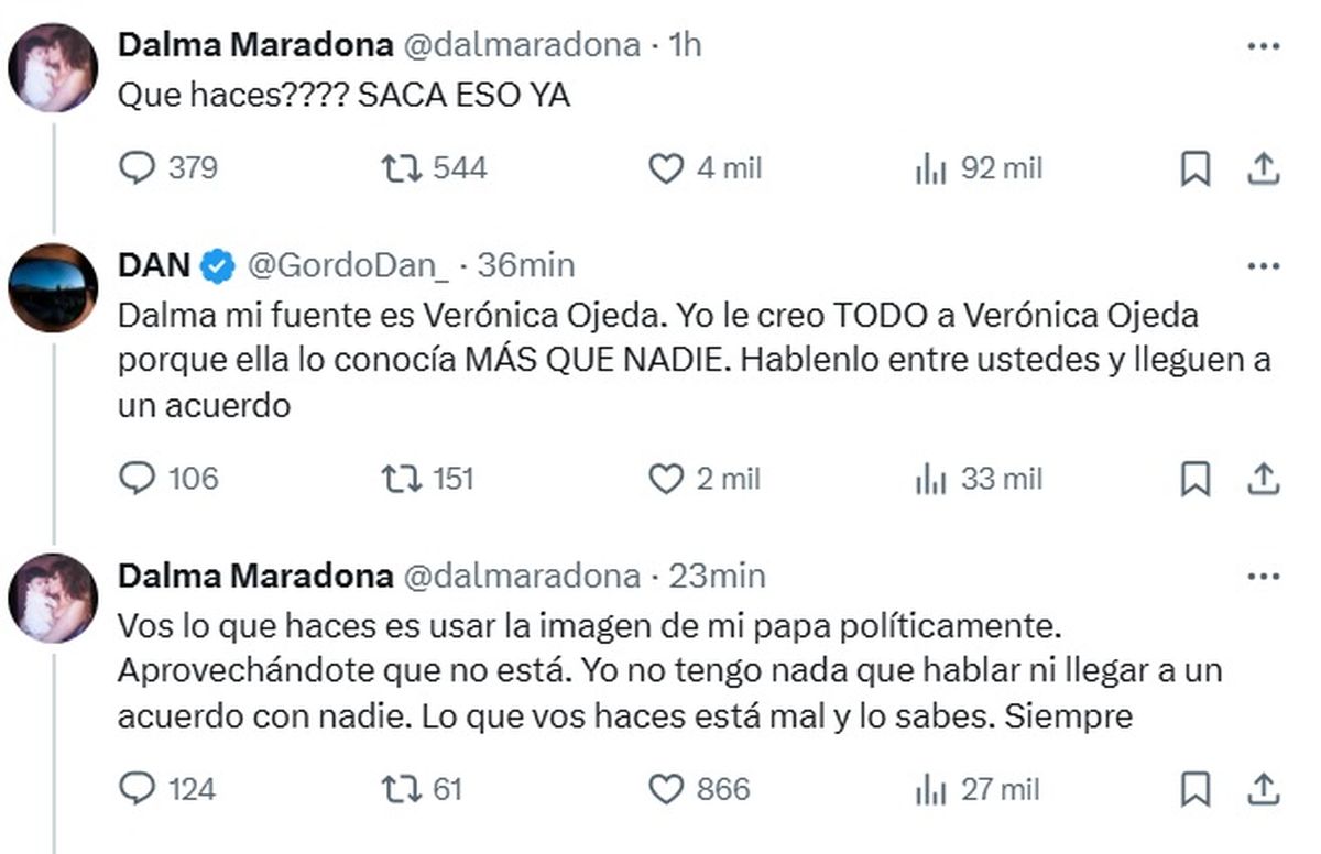 Y ella le remarcó: "Vos lo que haces es usar la imagen de mi papa políticamente. Aprovechándote que no está. Yo no tengo nada que hablar ni llegar a un acuerdo con nadie. Lo que vos haces está mal y lo sabes. Siempre".