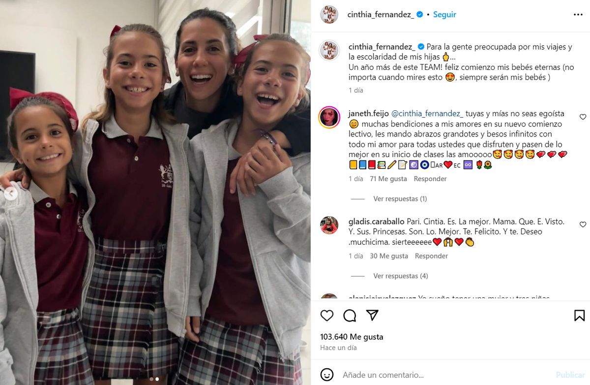 Después, en una publicación que hizo en sus redes sociales junto a una foto con sus tres hijas, Cinthia sumó sarcástica: “Para la gente preocupada por mis viajes y la escolaridad de mis hijas”.