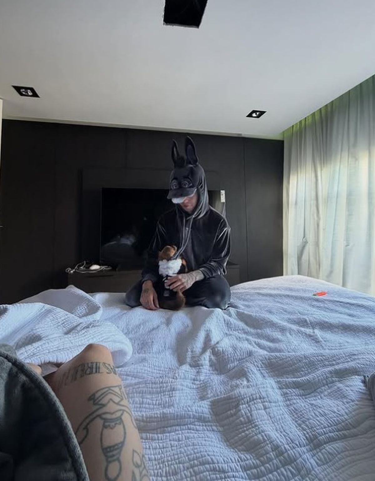 En la postal que se incluyó en un posteo con varias fotos, se ve al cantante cordobés lookeado con un particular disfraz de un perro y acompañado de su mascota al borde de la cama mientras La Joaqui se encontraba sobre el respaldo y se veía su pierna tatuada al descubierto.