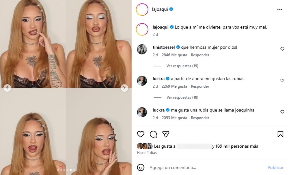 Como era de esperarse, la publicación no pasó inadvertida y rápidamente se llenó de comentarios positivos. Entre los mensajes destacados apareció el de Tini Stoessel, quien no escatimó elogios y expresó:“¡Qué hermosa mujer por Dios!”. Por su parte, Luck Ra, pareja de la cantante, también dijo presente con su toque de humor:“A partir de ahora me gustan las rubias”.