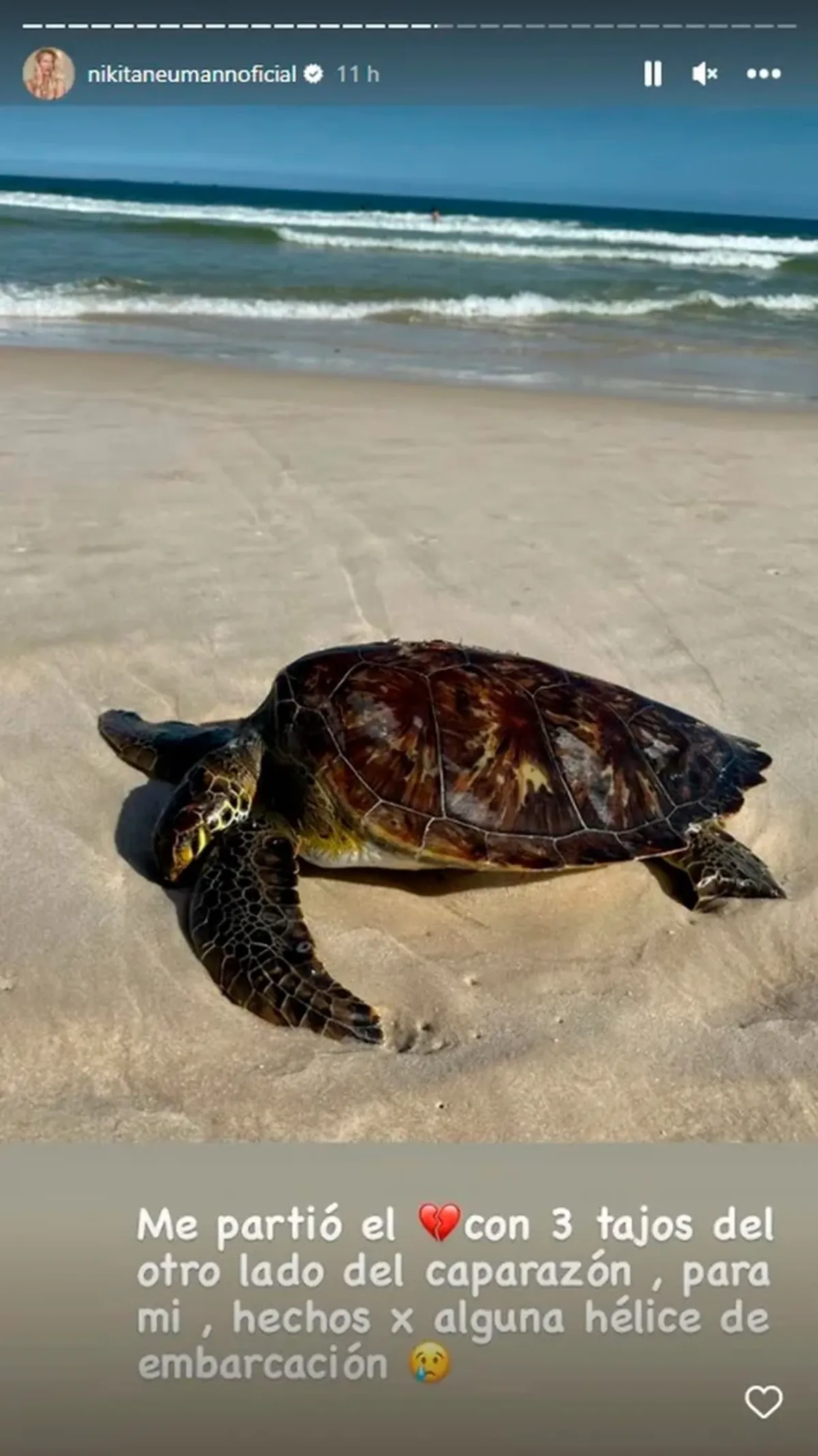 Nicole precisó que notó tres heridas en el caparazón de la tortuga y esbozó una teoría el respecto. "Tiene tres tajos del otro lado. Para mí fueron hechos por la hélice de una embarcación", sostuvo la rubia.