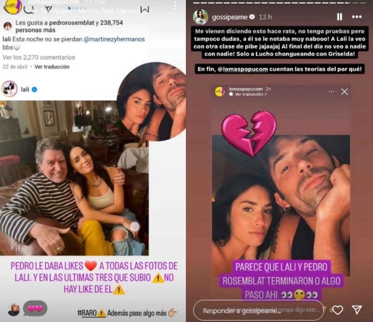 Según detalló la cuenta de Instagram Lomaspopucom, Lali Espósito y Pedro Rosemblat estarían distanciados. "Pedro le daba likes a todas las fotos de ella y en las últimas tres que subió no hay likes de él. Raro", remarcaron sobre el tema.