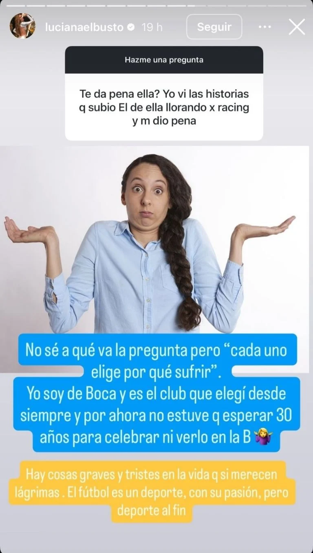 Esta vez, Luciana , luego de abrir una caja de preguntas en Instagram, se expresó públicamente sobre el momento que generó gran repercusión en las redes, donde muchos seguidores se conmovieron con la reacción de Insinga, que mostró toda su pasión por su equipo. "¿Te da pena ella? Yo vi las historias que subió él de ella llorando por Racing y me dio pena", le preguntó un seguidor.