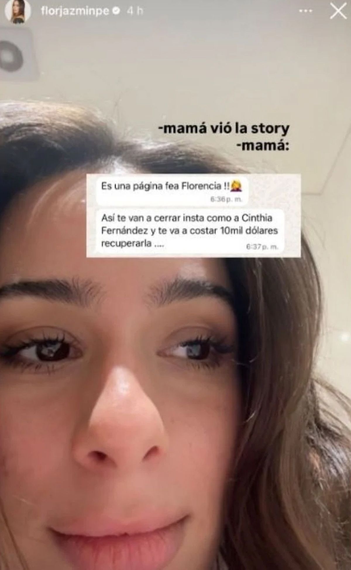 “Es una página fea, Florencia. Así te van a cerrar Instagram como a Cinthia Fernández y te va a costar 10 mil dólares recuperarla”, escribió, señalando no solo el contenido del clip, sino también los riesgos concretos que puede traer aparejado.