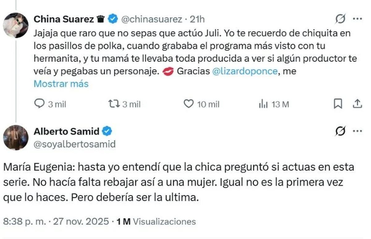 "María Eugenia: hasta yo entendí que la chica preguntó si actuás en esta serie. No hacía falta rebajar así a una mujer. Igual no es la primera vez que lo hacés. Pero debería ser la última", fue el posteo que publicó desde su cuenta de X, con el que Samid cuestionó a La China debajo del mensaje de la actriz dirigido a Poggio en la ex red social del pajarito.