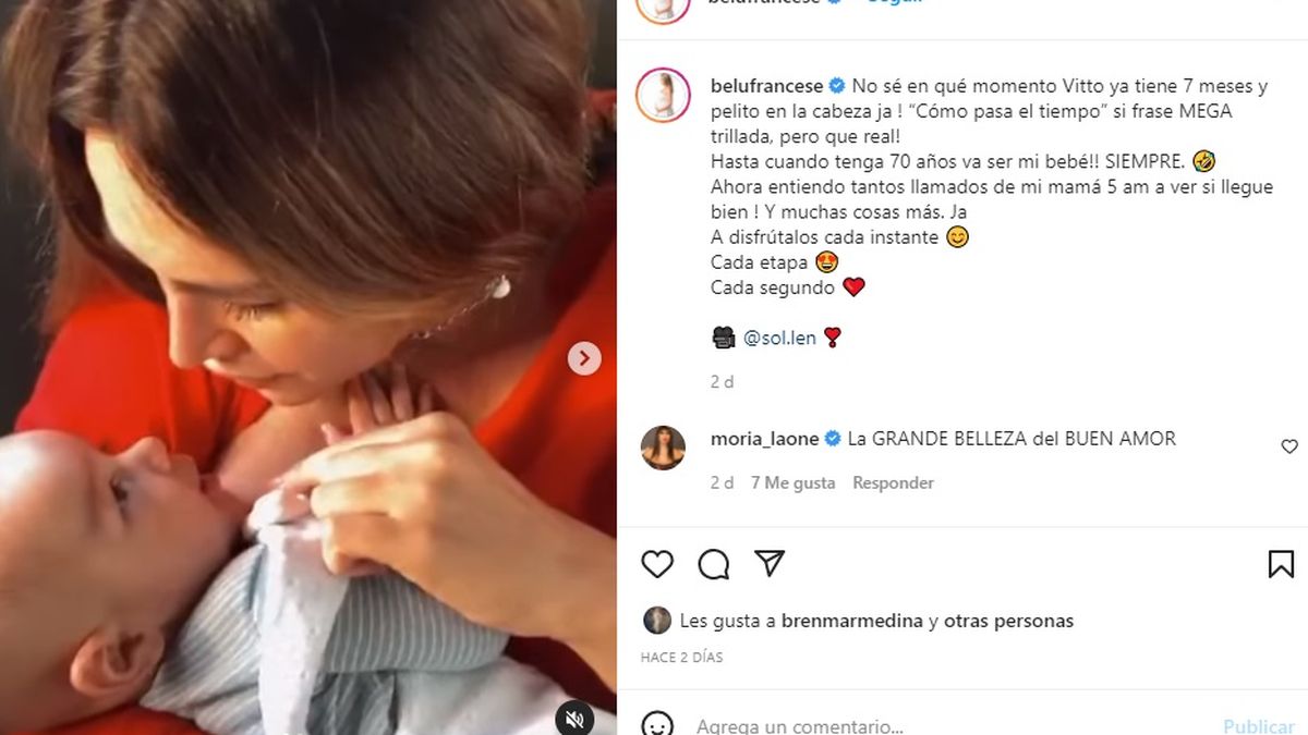 "No sé en qué momento Vitto ya tiene 7 meses y pelito en la cabeza ja ! “Cómo pasa el tiempo” si frase MEGA trillada, pero que real! Hasta cuando tenga 70 años va ser mi bebé!! SIEMPRE", indicó Belén Francese emocionada, quien desde que nació su hijo se dedicó a pleno a su crecimiento y se alejó un poco de su trabajo artístico.