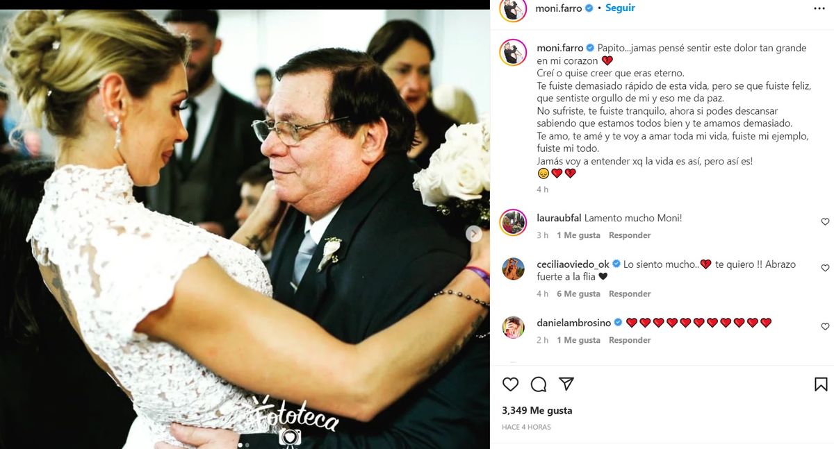 “Papito... Jamás pensé sentir este dolor tan grande en mi corazón”, comenzó diciendo Farro junto a una foto con su padre en el día de su casamiento con Leandro Herrera. “Creí o quise creer que eras eterno”, añadió.