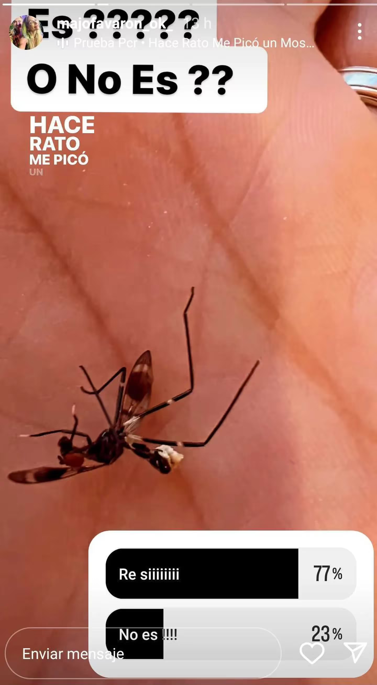En Instagram, Favarón colgó una imagen del insecto que logró matar y dejó entrever su confusión, ya que abrió le vio manchas blancas pero no logró convencerse de si era o no el transmisor del dengue. “Re siii”, fue la opción elegida por sus followers.