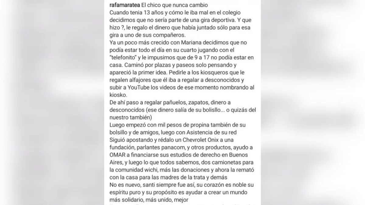 "Su corazón es noble y su espíritu puro. Su propósito es ayudar a crear un mundo más solidario, unido, mejor", concluyó el papá de Santi Maratea.