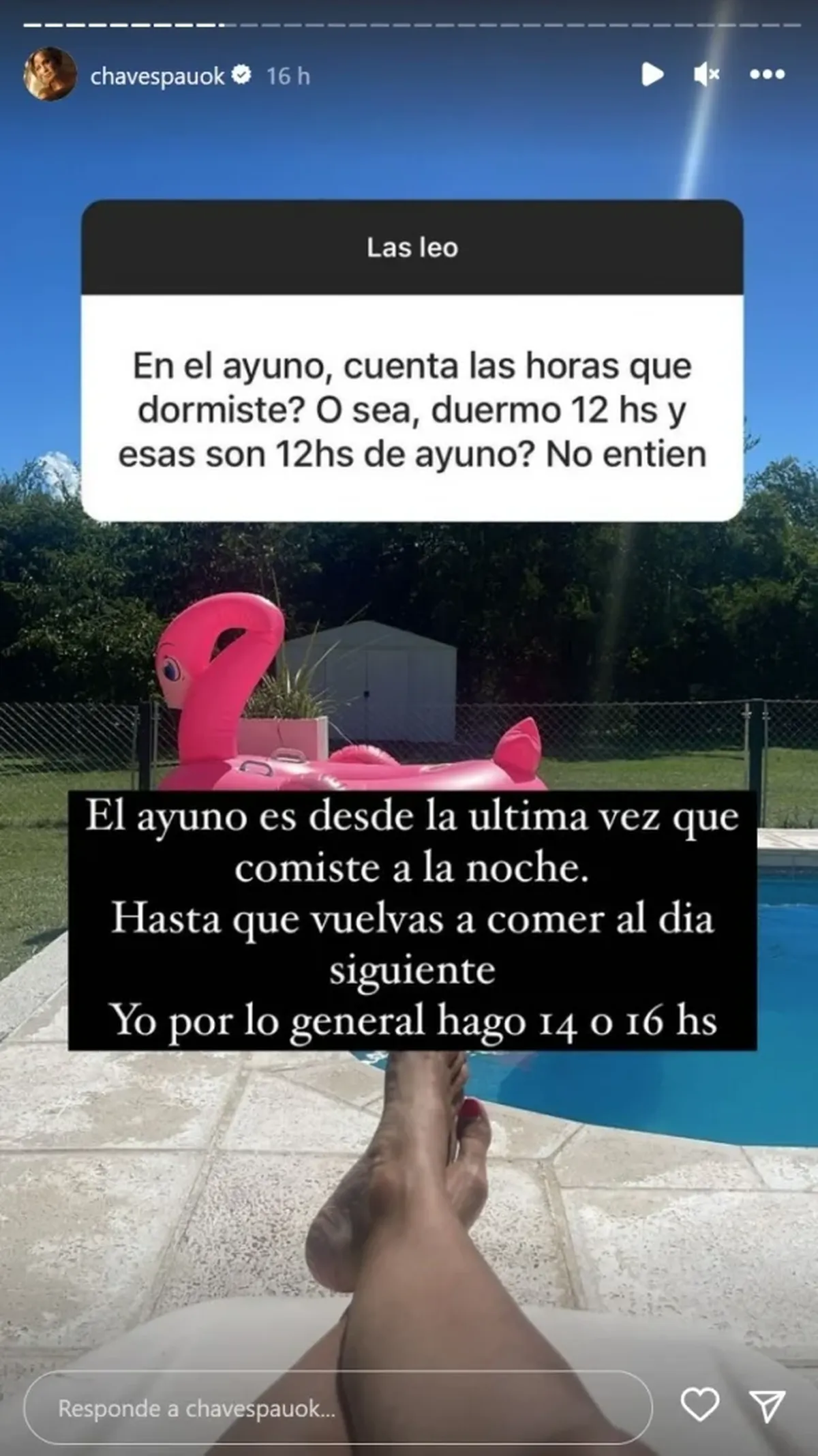 Enseguida, Chaves comenzó a recibir preguntas de sus seguidores. "El ayuno es desde la última vez que comiste a la noche, hasta que vuelvas a comer al día siguiente. Yo por lo general hago 14 o 16 (horas de ayuno). A la mañana tomo mate amargo. Los beneficios son más fuerza, más energía y mejor humor post entrenamiento", detalló.