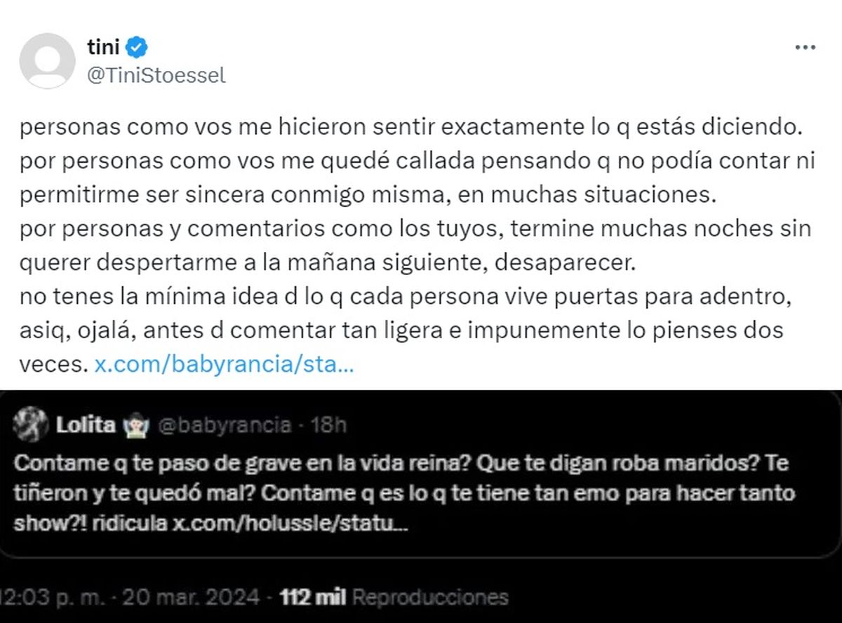 A lo que la cantante se hizo eco de este mensaje, que luego fue eliminada por dicha usuaria, y reflexionó de manera profunda: "Personas como vos me hicieron sentir exactamente lo que estás diciendo. Por personas como vos me quedé callada pensando que no podía contar ni permitirme ser sincera conmigo misma, en muchas situaciones".