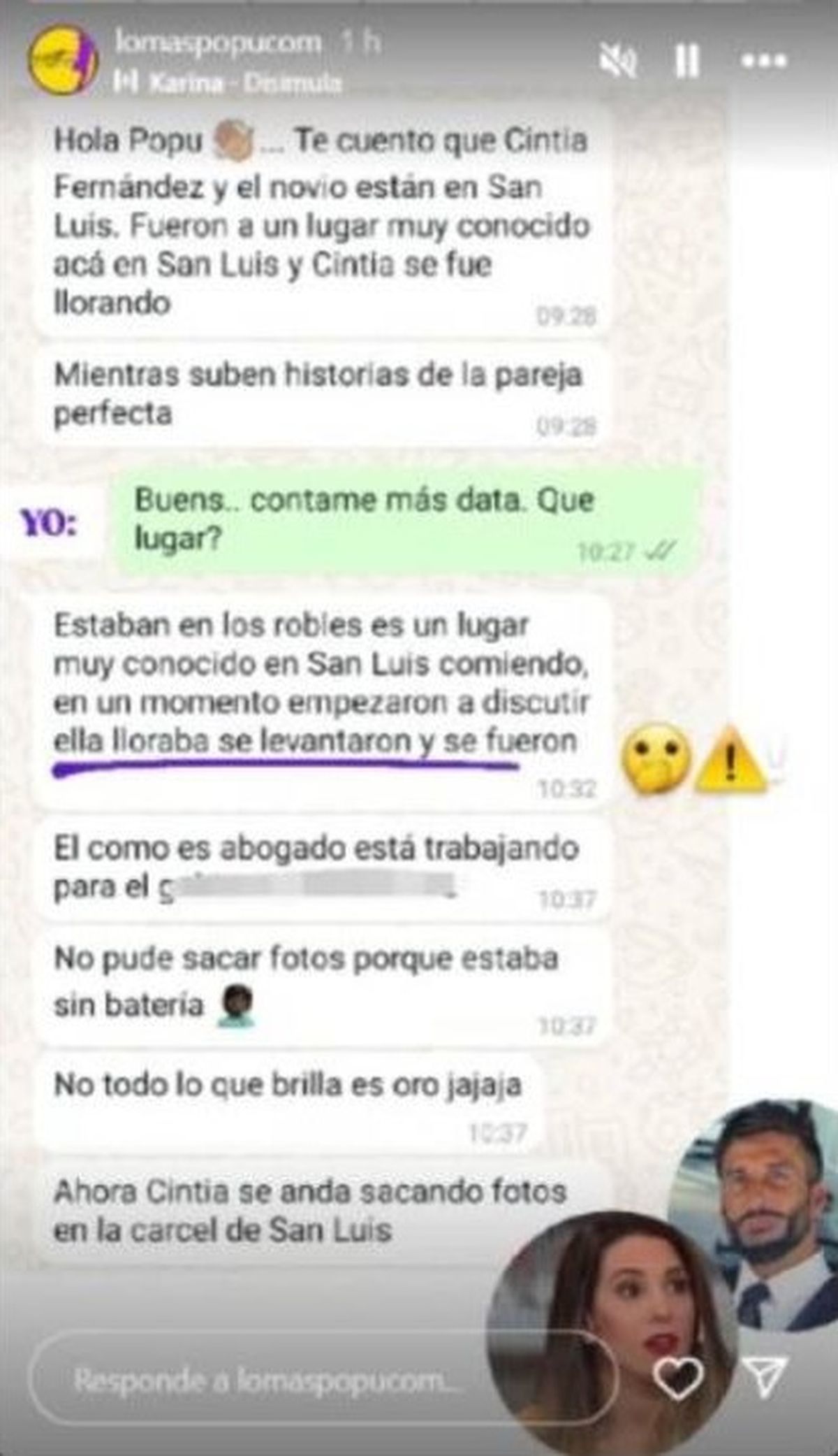 "Cinthia Fernández y el novio fueron a un lugar muy conocido acá en San Luis y ella se fue llorando mientras suben historias de la pareja perfecta", se leía en la conversación.