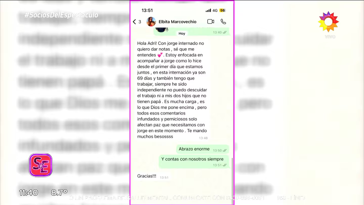 “¡Hola Adri! Con Jorge internado no quiero dar notas, sé que me entendes. Estoy enfocada en acompañar a Jorge como lo hice desde el primer día que estamos juntos”, le dijo.
