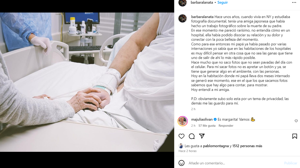 Y reconoció: "No entendía cómo en un hospital, ella había podido disociar su relación y su dolor y conectar con la poca belleza del momento. Como para ese entonces mi papá ya había pasado por varias internaciones yo sabía que en las habitaciones de los hospitales es muy difícil pensar en otra cosa que no sea las ganas que tiene uno de salir de ahí lo más rápido posible".