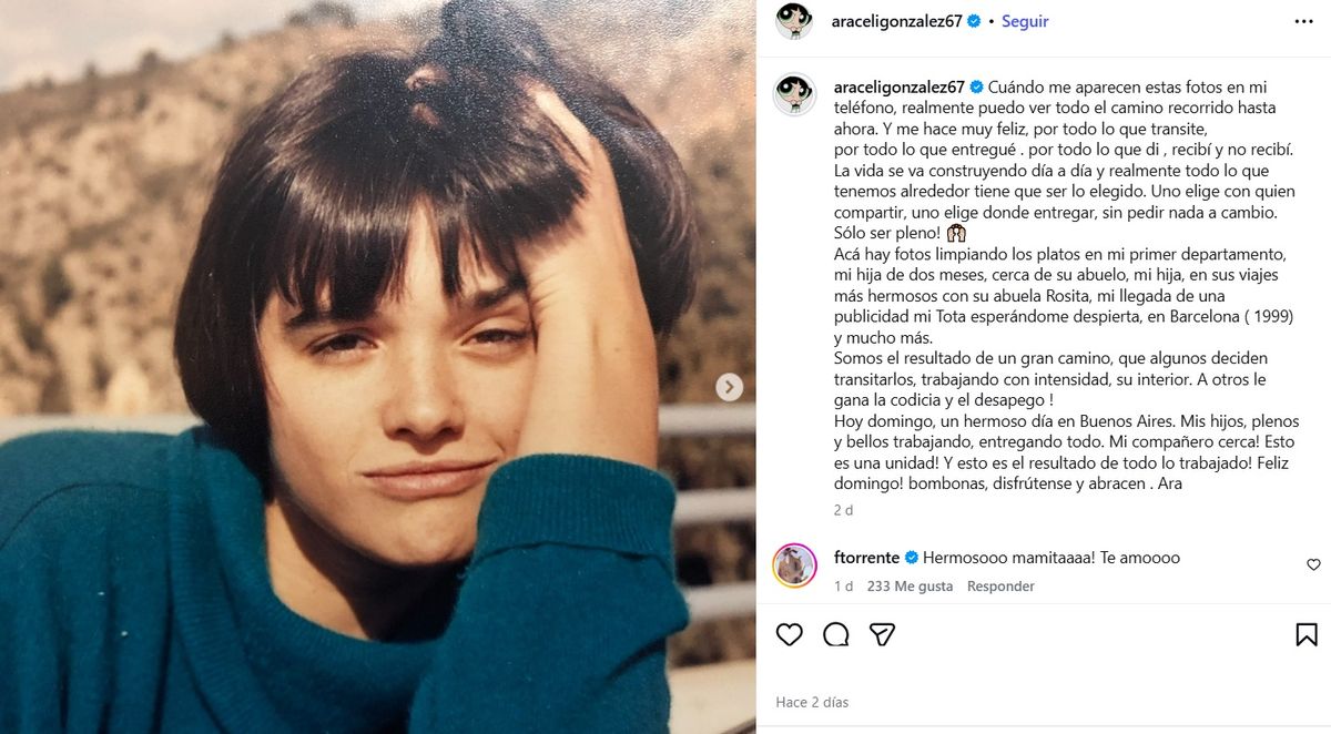 "Acá hay fotos limpiando los platos en mi primer departamento, mi hija de dos meses, cerca de su abuelo, mi hija, en sus viajes más hermosos con su abuela Rosita, mi llegada de una publicidad mi Tota esperándome despierta, en Barcelona (1999) y mucho más", explicó Araceli González sobre las imágenes que mostró de años atrás.