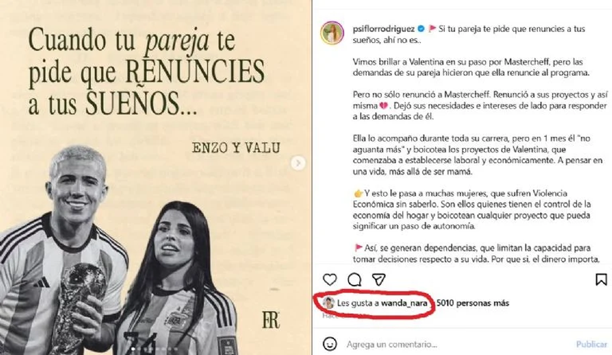 Por eso, Wanda, ya sea porque le quedó picando que Enzo no mostró interés en ella o porque realmente valoraba el paso de Valu por MasterChef, le dio “like” (que luego borró) a una polémica publicación de un usuario que reflexionaba sobre la decisión tomada. “Si tu pareja te pide que renuncies a tus sueños, ahí no es…”, escribió la psicóloga Florencia Rodríguez en el primer párrafo del texto.