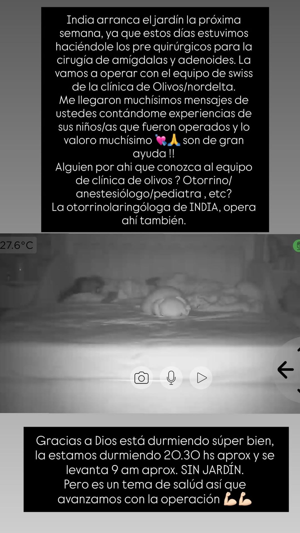 Para cerrar, compartió una tierna imagen de su hija durmiendo y escribió: "Gracias a Dios está durmiendo súper bien, la estamos durmiendo 20.30 y se levanta a las 9 aproximadamente, sin jardín. Pero es un tema de salud así que avanzamos con la operación".