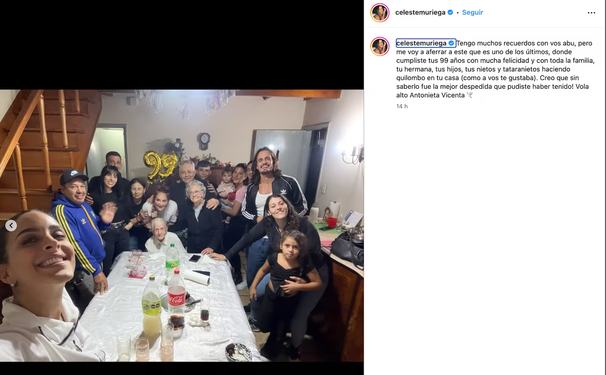 Desde sus redes sociales, Celeste Muriega despidió con un emotivo mensaje a su abuela Antonieta Vicenta. Mirá el posteo que hizo en esta nota.