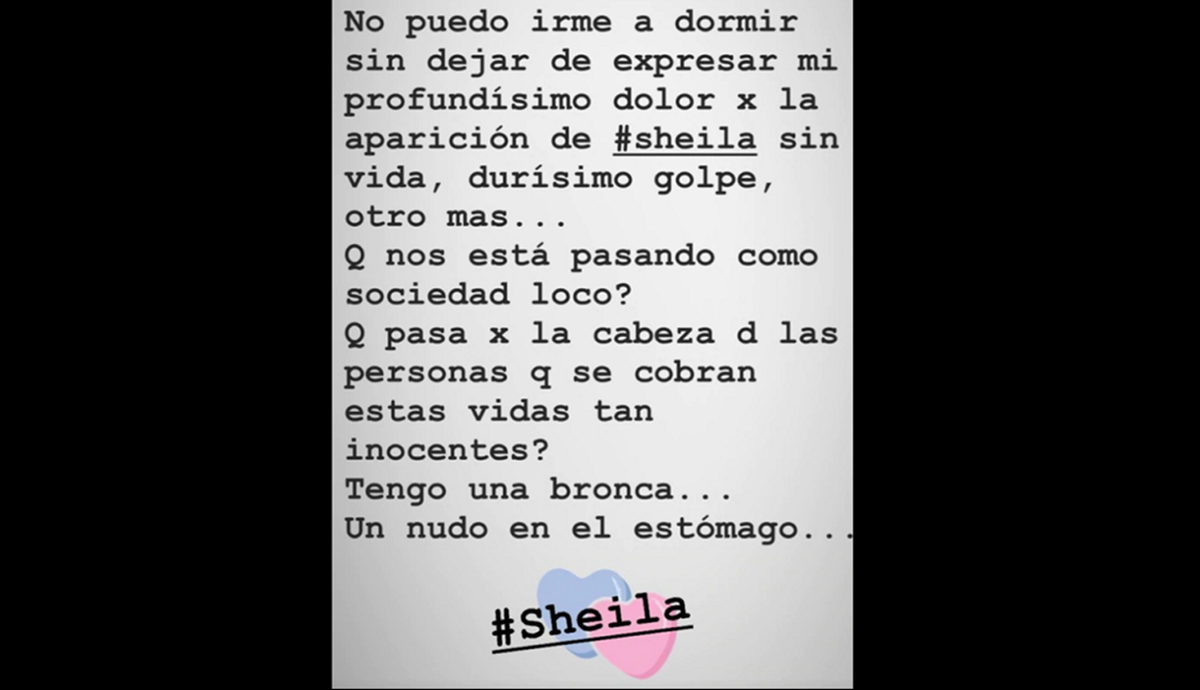 "No puedo irme a dormir sin dejar de expresar mi profundísimo dolor por la aparición de Sheila sin vida. Durísimo golpe, otro más... ¿Qué nos está pasando como sociedad, loco? ¿Qué pasa por la cabeza de las personas que se cobran estas vidas tan inocentes? Tengo una bronca... Un nudo en el estómago...", escribió el artista.