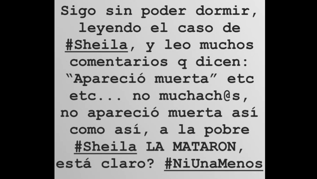 Más tarde, escribió otro texto: "Sigo sin poder dormir leyendo el caso de Sheila, y leo muchos comentarios que dicen: 'Apareció muerta', etcétera, etcétera... No, muchach@s, no apareció muerta así como así. A la pobre Sheila LA MATARON, ¿está claro?".