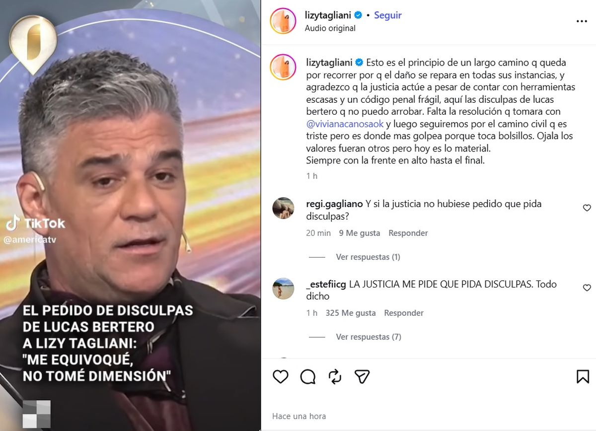 El pedido de disculpas públicas de Lucas Bertero a Lizy Tagliani llegó en televisión en el programa Intrusos y la conductora compartió después un contundente mensaje desde su cuenta en Instagram con un fragemento del testimonio al aire del periodista y también le advierte a Viviana Canosa por la denucia por calumnias e injurias que le inició tiempo atrás.