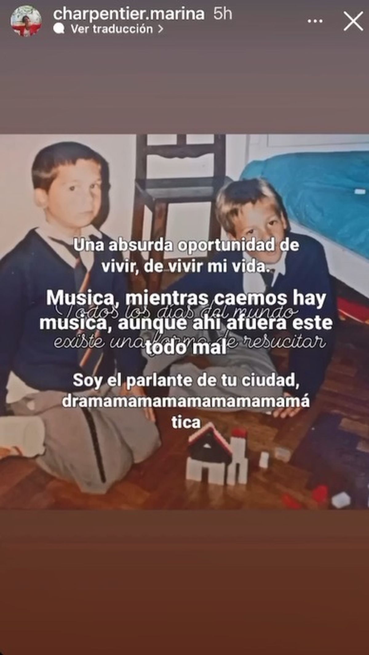 Agradecida la madre del músico, no dudó en repostear esos emotivos videos a modo de firme esperanza de recuperación de su hijo, a los que le sumó una tercera historia virtual con una fotografía de Chano y su otro hijo, Bambi, chiquitos al ritmo de Música, otro hit de Tan Biónica.