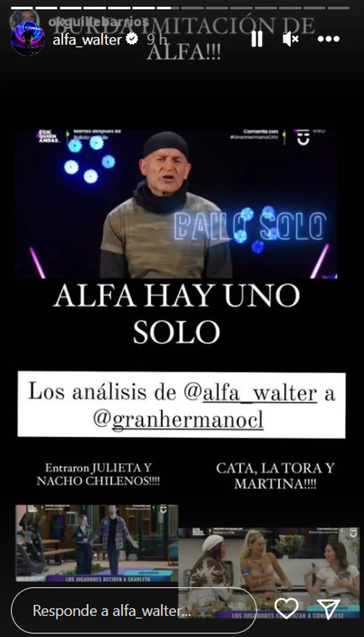 En su cuenta de Instagram, Alfa compartió una imagen de la presentación de Francisco. El panelista de Polémica en el bar reposteo un mensaje que le llegó, que resumió su opinión: "Burda imitación de Alfa", a lo que él agregó: "Alfa hay uno solo".