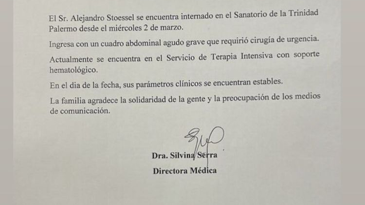 “Mucha fuerza para la familia Stoessel. Alejandro está internado. Su estado es delicado pero estable. La familia pide respeto y privacidad en este momento difícil”, detalló la conductora en su cuenta de Twitter.
