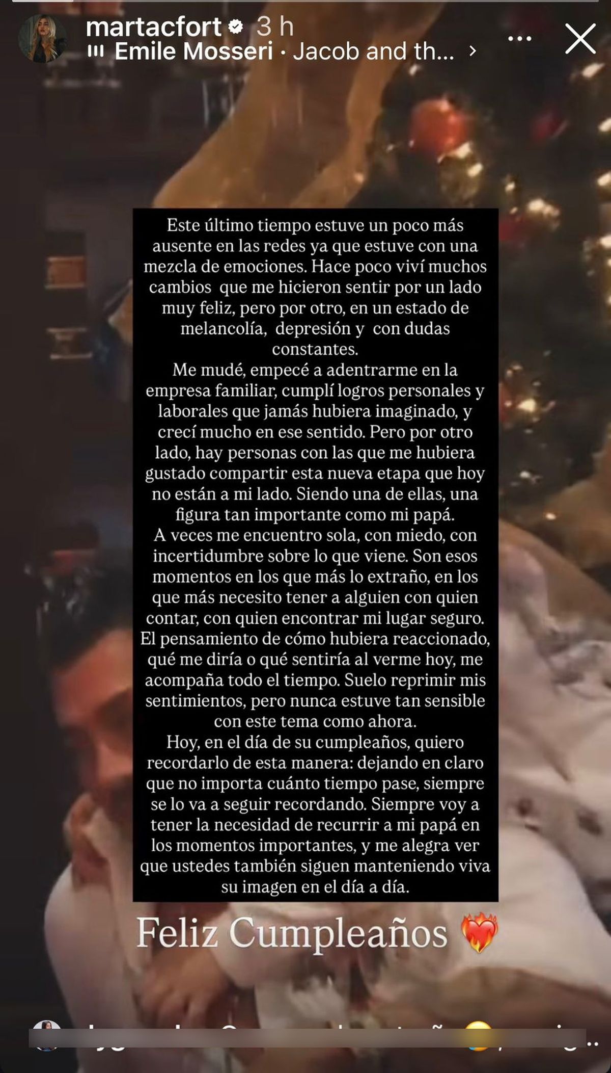 Con un extenso texto sobre un video en el que se la ve de pequeña junto a su papá, Martita escribió en sus Instagram Stories sus más emotivas palabras en esta fecha tan especial tanto para ella como para su hermano Felipe.