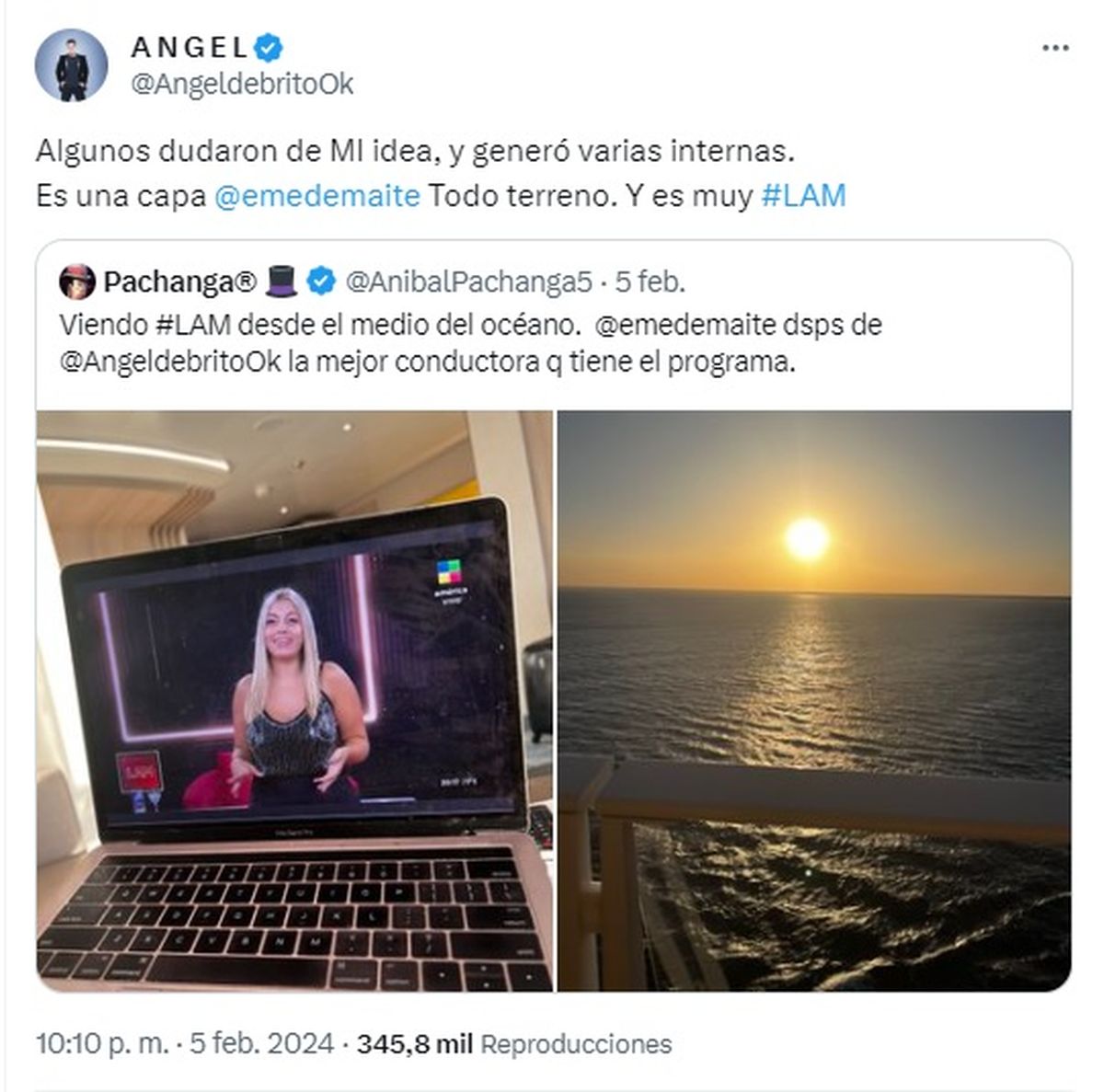 "Algunos dudaron de MI idea, y generó varias internas. Es una capa Maite. Todo terreno. Y es muy #LAM" dejó en claro Ángel de Brito, quien precisamente este miércoles regresa de sus vacaciones y retoma las riendas de su programa, que sin duda quedó en excelentes manos durante todos estos días.