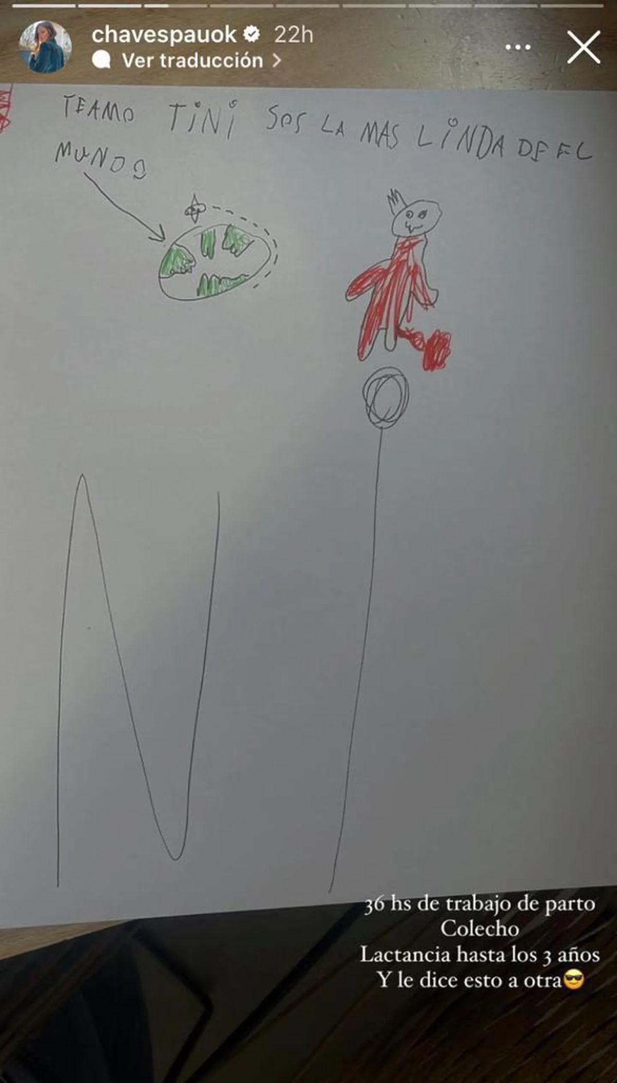 Desde sus redes sociales, la modelo mostró el mensaje de su hijo para Tini y se lo recriminó. “¿Qué hiciste?”, le preguntó Paula a su hijo, mientras dibujaba en una hoja. “Un dibujo”, le respondió Baltazar. “¿A quién?”, quiso saber la actriz.