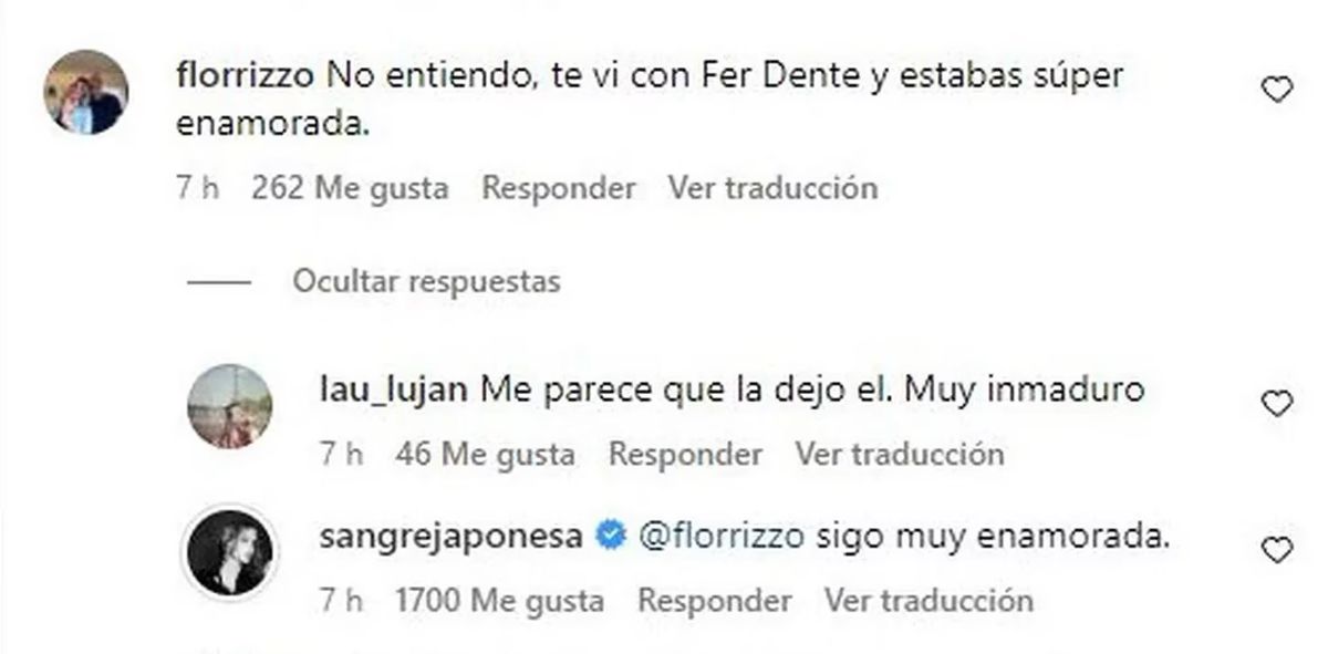 Lo cierto es que ante el comentario de una internauta diciendo "No entiendo, te vi con Fer Dente y estabas súper enamorada", la China Suárez le respondió sin medias tintas de manera contundente: "Sigo muy enamorada".
