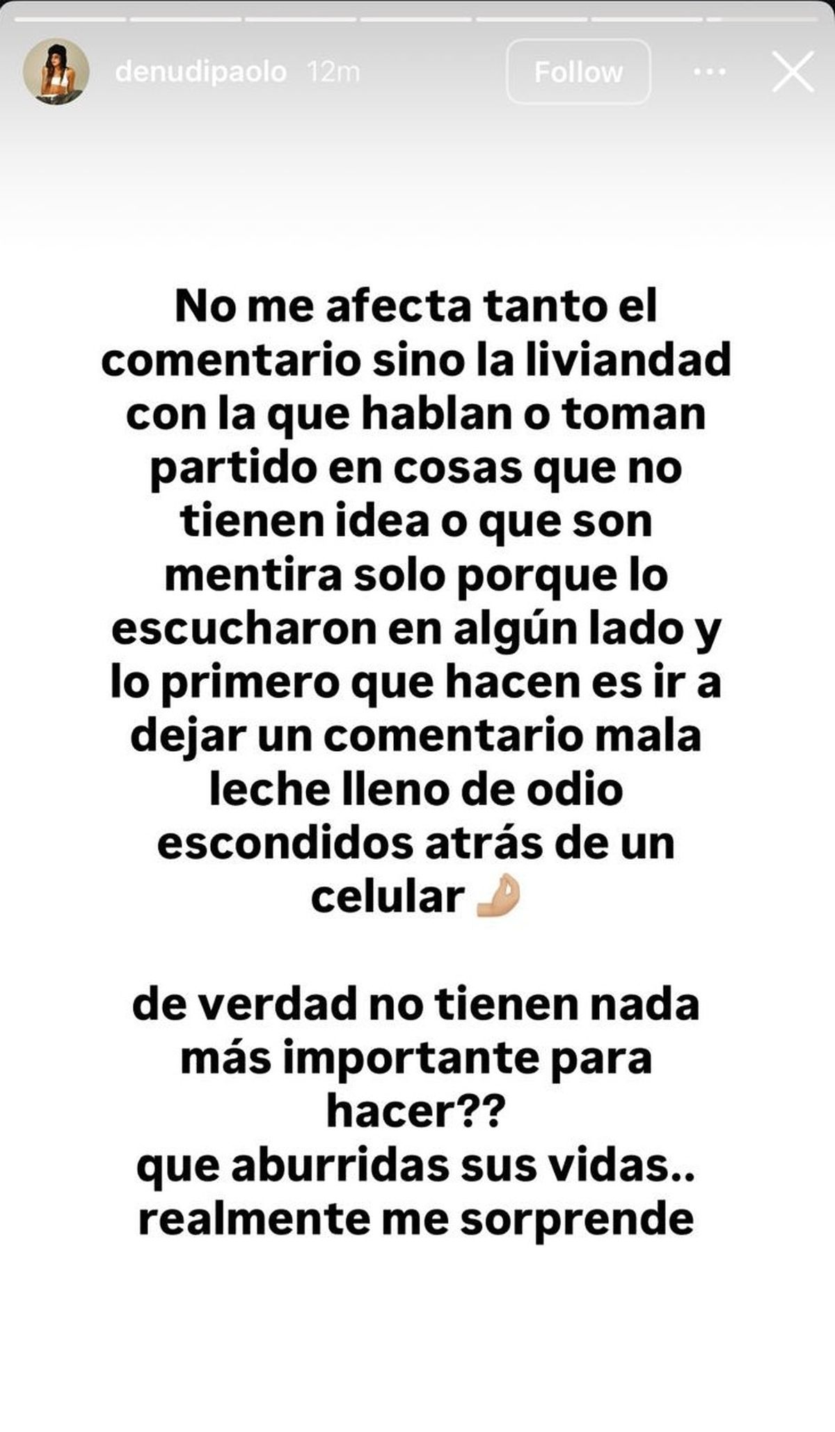 Además, siguió su relaato sumamente enojada: "No me afecta el comentario, sino la liviandad con la que hablan o toman partido en cosas de las que no tienen idea o que son mentira, solo por lo que escucharon en algún lado, y lo primero que hacen es ir a dejar un comentario mala leche, lleno de odio, escondidos detrás del celular".