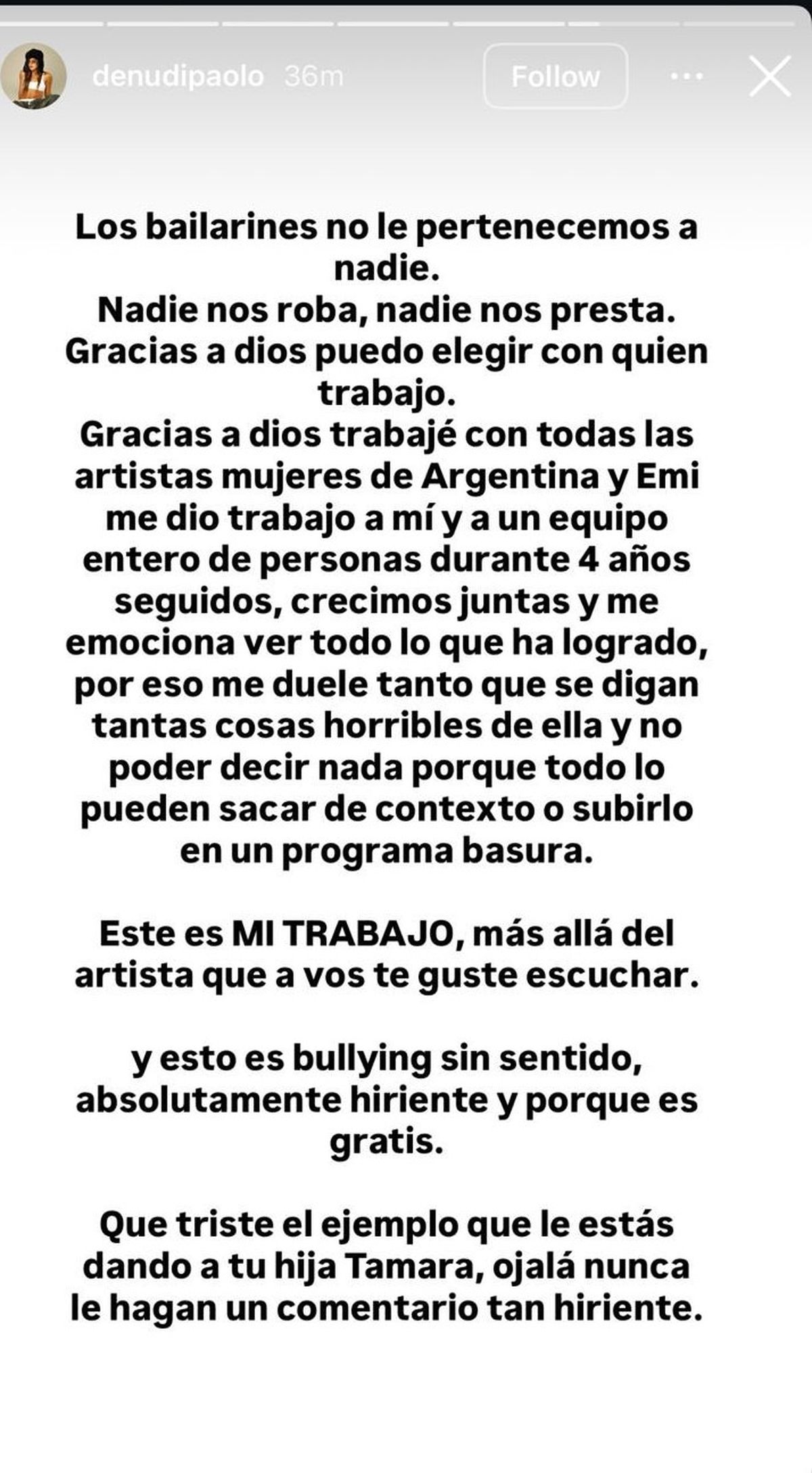 "Los bailarines no le pertenecemos a nadie. Nadie nos roba, nadie nos presta. Gracias a Dios puedo elegir con quién trabajo. Gracias a Dios trabajé con todas las artistas mujeres de Argentina, y Emi me dio trabajo a mí y a un equipo entero de personas durante cuatro años seguidos; crecimos juntas y me emociona ver todo lo que ha logrado. Por eso me duele tanto que se digan tantas cosas horribles de ella y no poder hacer nada, porque todo lo pueden sacar de contexto o subirlo en un programa basura", dijo en primer lugar, valorando a Mernes.