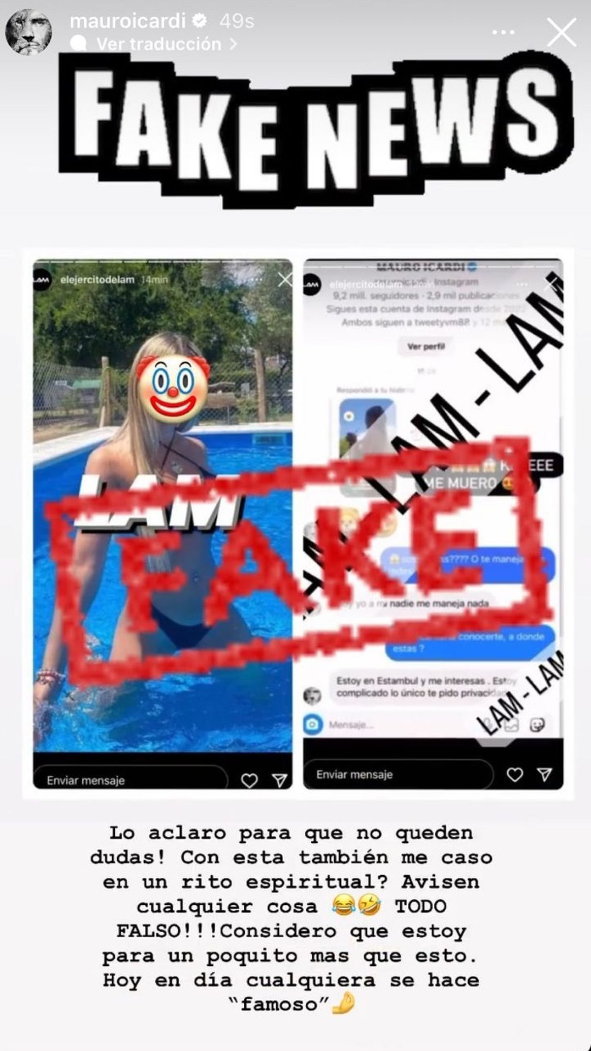 "¡Lo aclaro para que quedan dudas! ¿Con esta también me caso en rito espiritual? Avisen cualquier cosa...(emojis de risas) TODO FALSO!!! Considero que estoy para un poquito más que esto. Hoy en día cualquiera se hace 'famoso' (emoji de una mano haciendo montoncito)", posteó enojado Mauro. A todo esto, ¿Qué opinará Wanda del asunto?