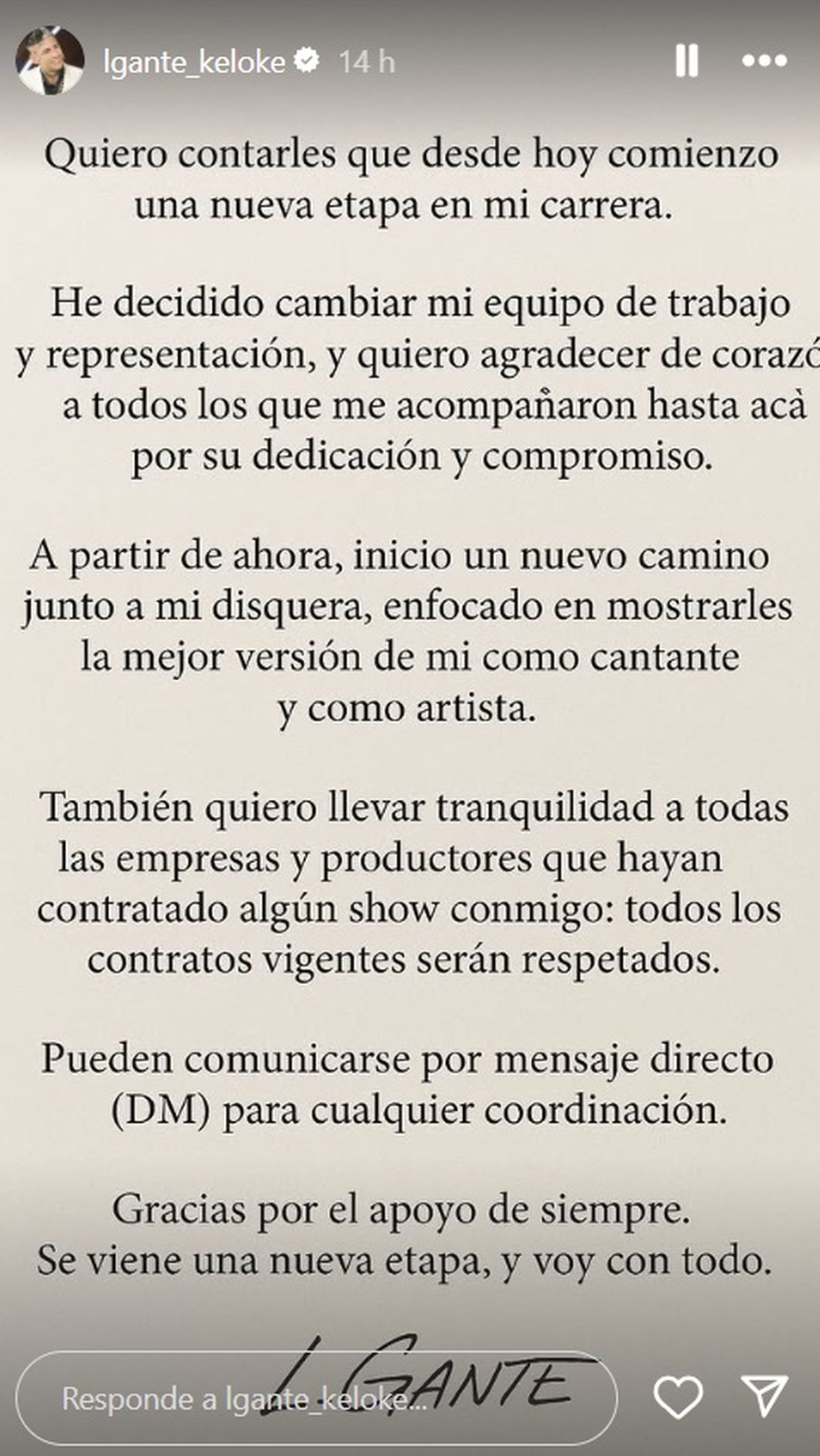 "También quiero llevar tranquilidad a todas las empresas y productores que hayan contratado algún show conmigo: todos los contratos vigentes serán respetados. Pueden comunicarse por mensaje directo para cualquier coordinación. Gracias por el apoyo de siempre, se viene una nueva etapa, y voy con todo", finalizó L-Gante.