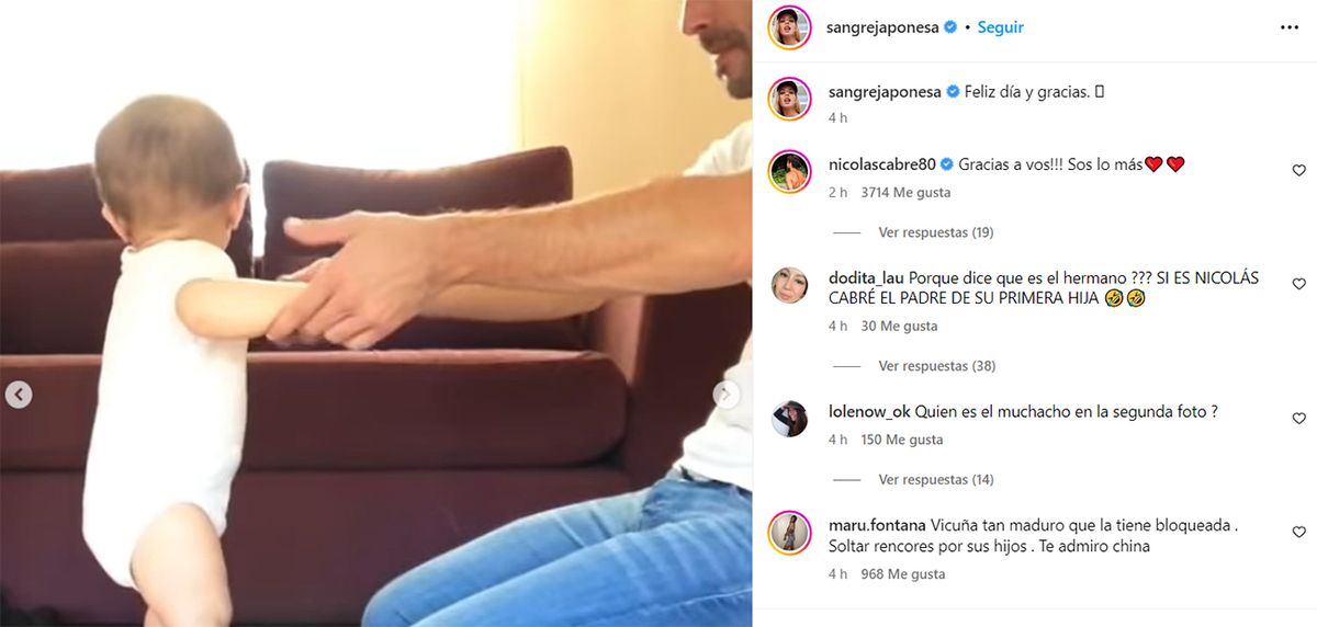 En el video de Cabré se lo ve al actor ayudando a su hija a dar sus primeros pasos. El actor, quien también publicó en su cuenta de Instagram diferentes fotos con Rufina para celebrar su día, le contestó a la China: “Gracias a vos. ¡Sos lo más!”.