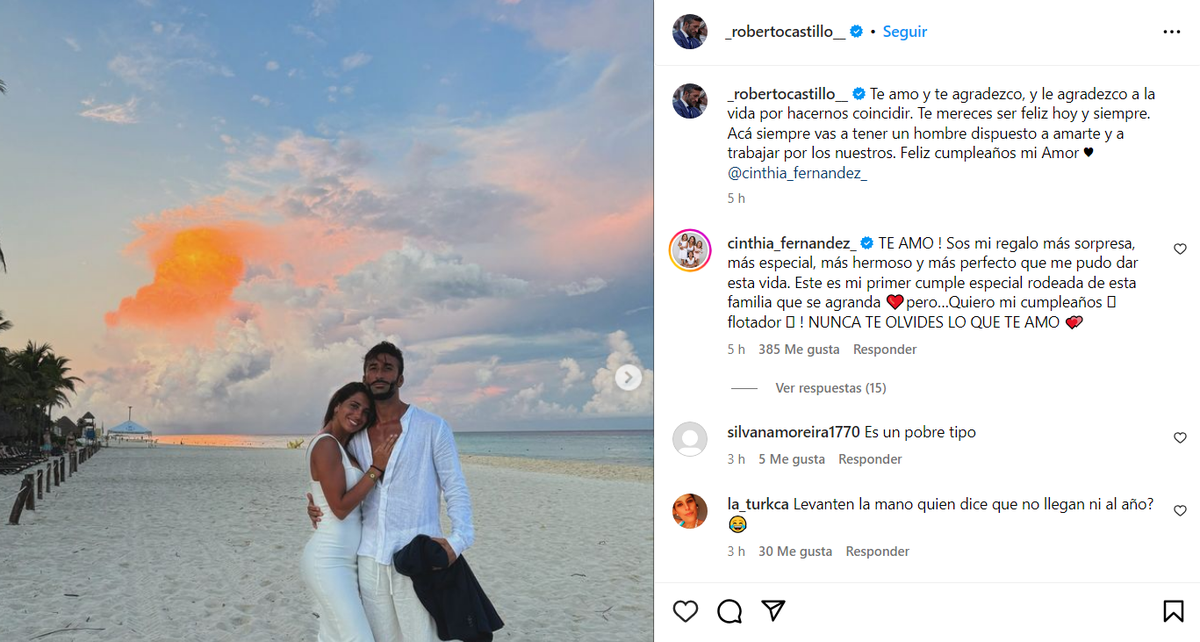 Conmovida por el gesto de su pareja, Cinthia no tardó en responder a la publicación y también le dejó un especial mensaje. "Te amo! Sos mi regalo más sorpresa, más especial, más hermoso y más perfecto que me pudo dar esta vida", expresó.
