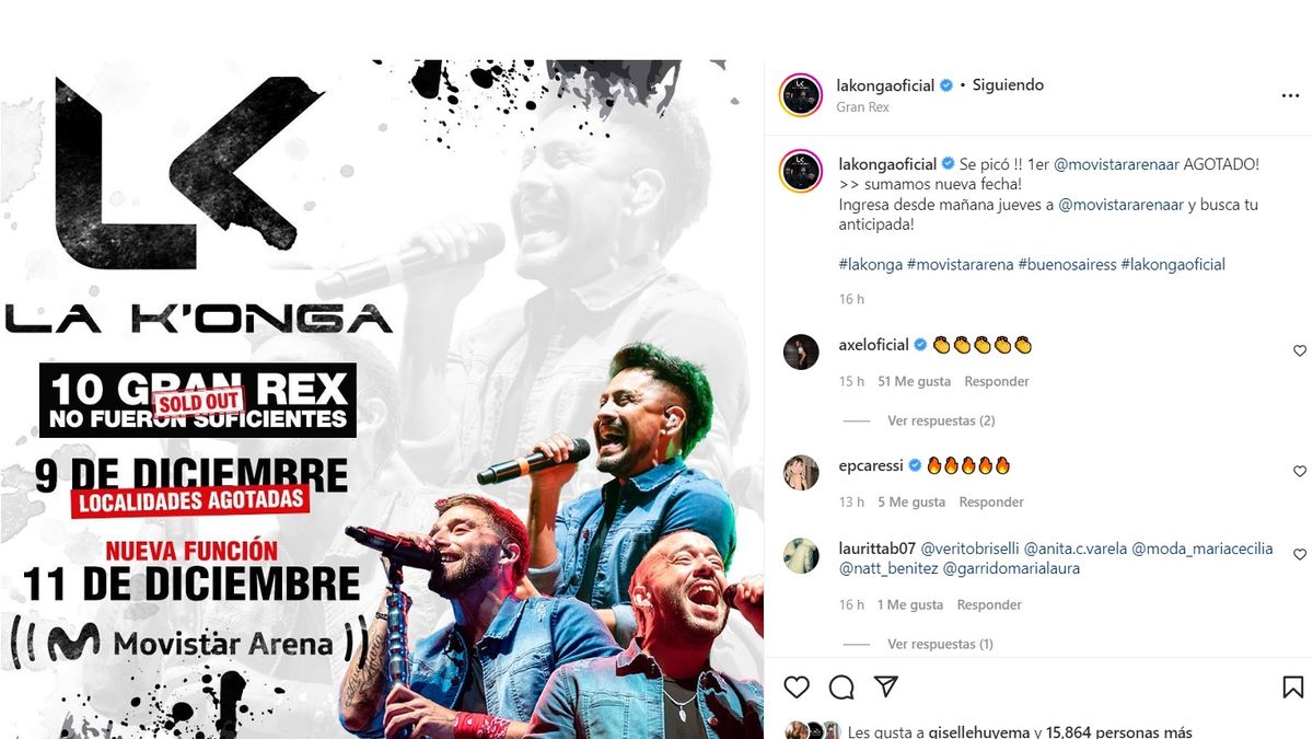 La Konga, en medio de un 2022 lleno de éxito y tras colmas diez Gran Rex de forma consecutiva, ya anunció dos fechas para cerrar el año en Capital Federal en el Movistar Arena de Villa Crespo los días 9 y 11 de diciembre. La primera función ya está totalmente agotada para ver a Pablo Tamagnini, Nelson Aguirre y Diego Granadé.