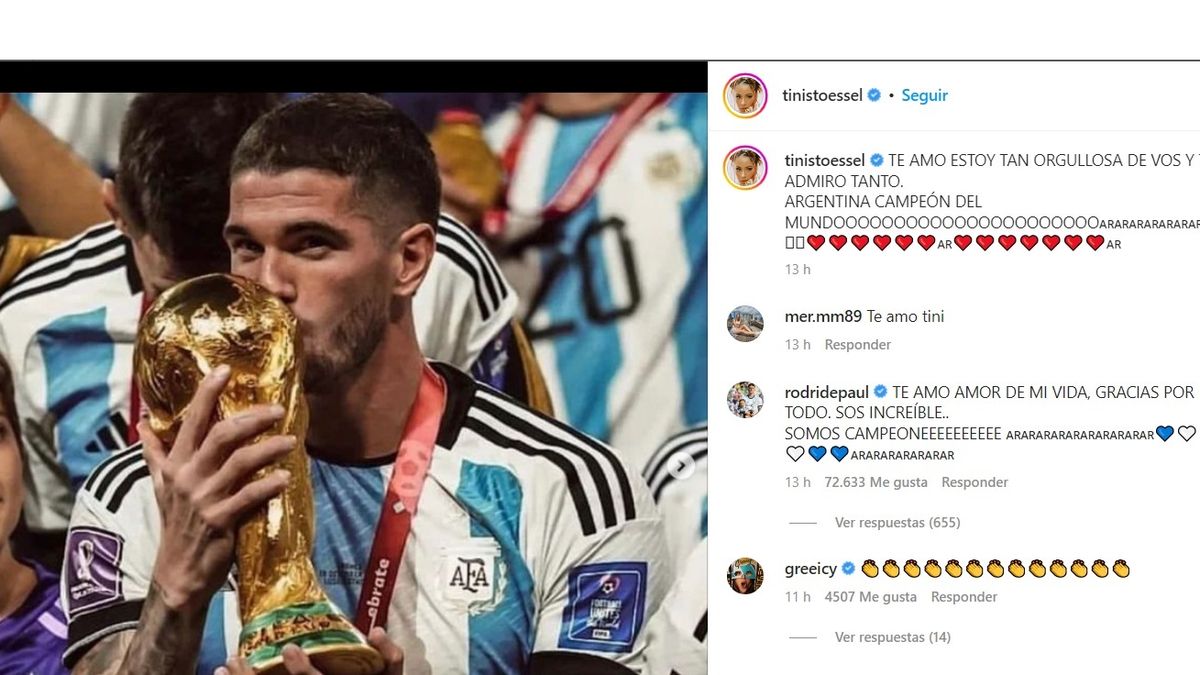 "Te amo. Estoy tan orgullosa de vos y te admiro mucho. Argentina campeón del mundo", expresó a pura alegría la cantante. A lo que Rodrigo comentó en la publicación: "Te amo amor de mi vida, gracias por todo. Sos increíble... Somos campeones", indicó muy emocionado.