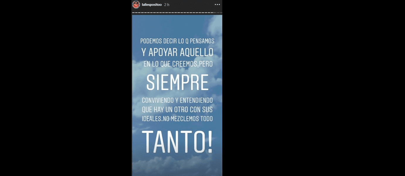 Y agregó: "Podemos decir lo que pensamos y apoyar aquello en lo que creemos, pero siempre conviviendo y entendiendo que hay un otro con sus ideales. ¡No mezclemos todo tanto!".
