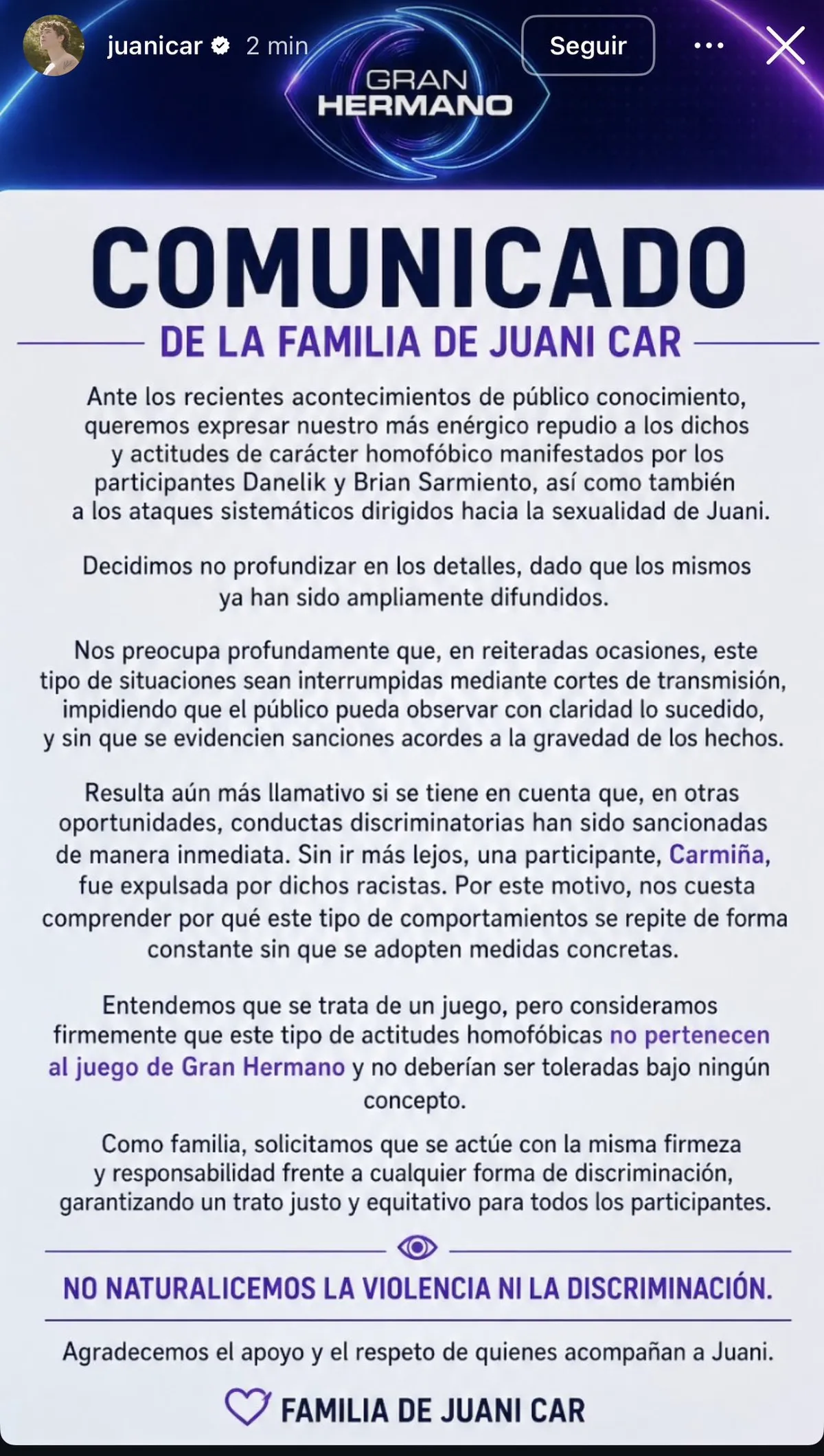 La familia de Juanicar se pronunció públicamente a través de un duro comunicado en Instagram, luego de que trascendieran presuntos ataques homofóbicos por parte de Danelik y Brian Sarmiento dentro del marco de Gran Hermano Generación Dorada (Telefe).