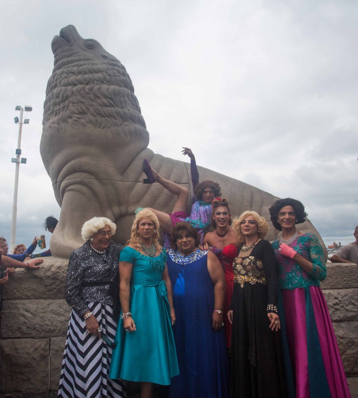 Así fue que pasadas las 18hs Diego Ramos, Fabián Vena, Gustavo Garzón, Boy Olmi, Roly Serrano, Pepe Novoa y Nicolas Riera en las pieles de estas glamorosas y bellas damas habitantes de esta casa, irrumpieron en la rambla marplatense para fotografiarse junto a los lobos marinos tan característicos de esta ciudad.