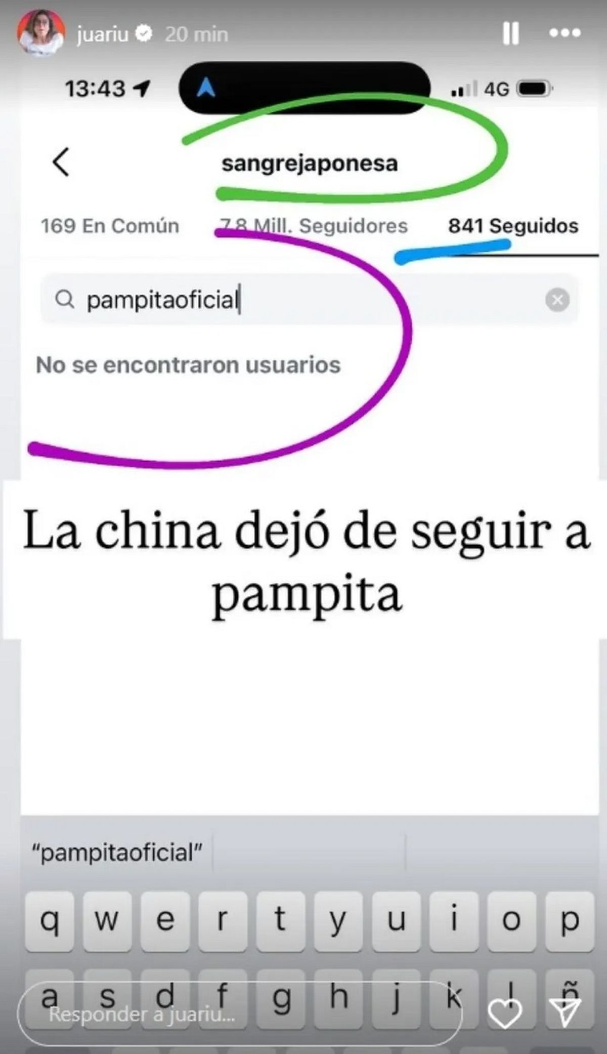 "La China dejó de seguir a Pampita", remarcó desde sus historias Juariu con la prueba virtual en cuestión que podría abrir un cortocircuito entre las dos luego de la paz que mantenían hace tiempo.