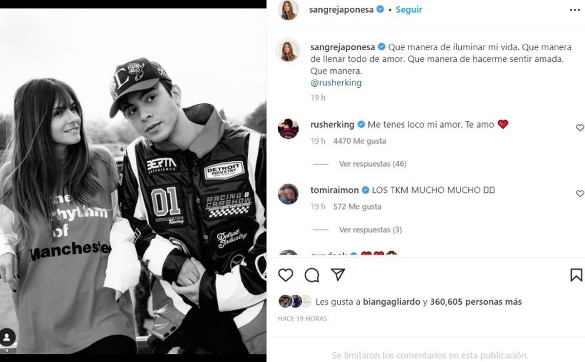 Rusherking no se quedó atrás, y no sólo le respondió la publicación con la frase "Me tenés loco mi amor. Te amo", sino que también compartió las imágenes del reencuentro en su cuenta, con la leyenda "Mi amoooor".