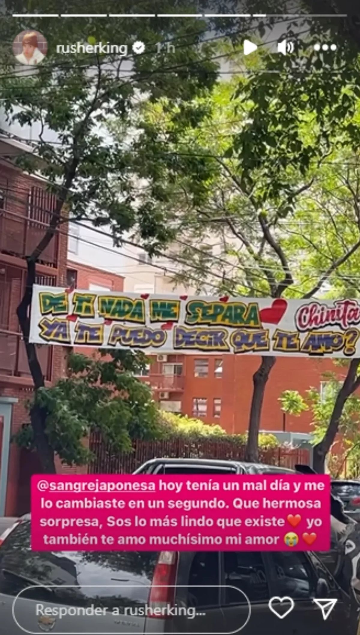 Rusherking le sacó una foto a ese pasacalles y la subió a sus historias en Instagram. “Hoy tenía un mal día y me lo cambiaste en un segundo. Qué hermosa sorpresa, sos lo más lindo que existe. Yo también te amo muchísimo, mi amor”, escribió.