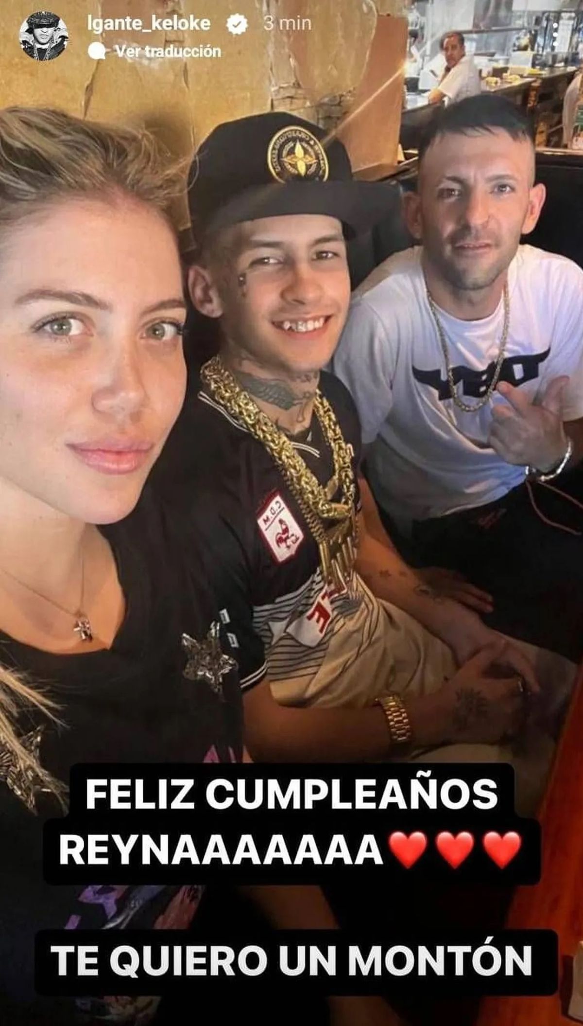 "Feliz cumpleaños, reina. ¡Te quiero un montón!", señaló L-Gante en la foto que Wanda Nara se tomó con él y alguien más.